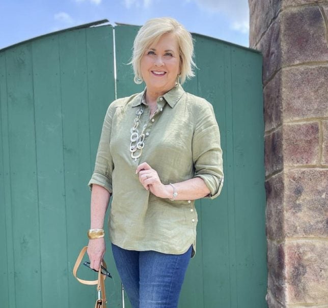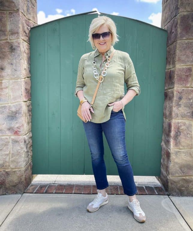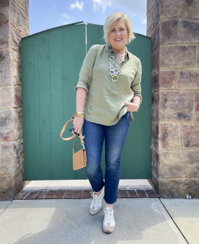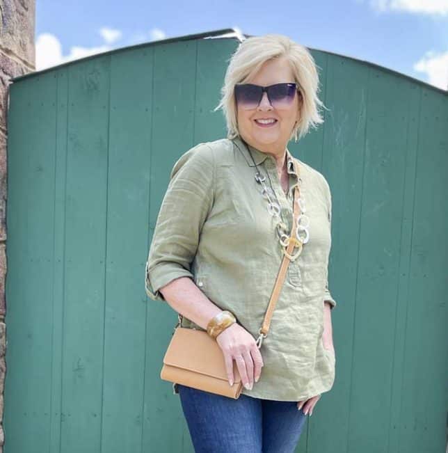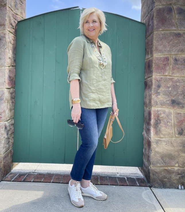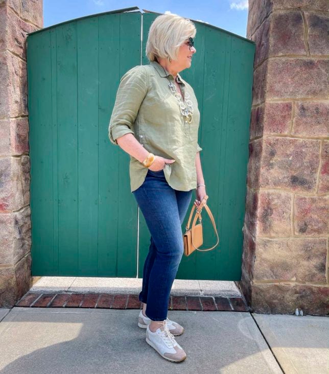 Today’s linen tunic is one that I bought on sale from Talbots a while back. I loved the color and knew that it would be great to wear this fall. Because Talbots has been having a HUGE ongoing sale for almost a month, almost everything that I’ve bought for myself is sold out online. So, this top is going to have to serve as an “inspiration” top, and not an “exact” top. I’ll link to tops below in a similar color, and, if you want, you can recreate the look with one of those.