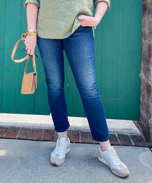 This is an ankle-length straight-leg pair of jeans. I think that this style of jeans works great with flats, heels, and boots, and they are very versatile. The dark rinse color looks great against the lighter green tunic, and I even think this color makes me look thinner. Don’t burst my bubble, just let me live in my fantasy world. Lol! I am wearing my usual size 10, so these run TTS.
