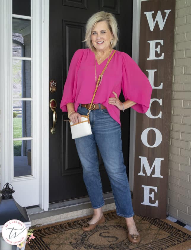 I’ve been wearing so much black or black and white, that I thought you might like to have a dose of color. This bright pink balloon sleeve blouse is a huge pop of color, and I like how it makes my face glow. The v-neck and the bishop-style sleeves are flattering, and the top camouflages a lot of my flaws.