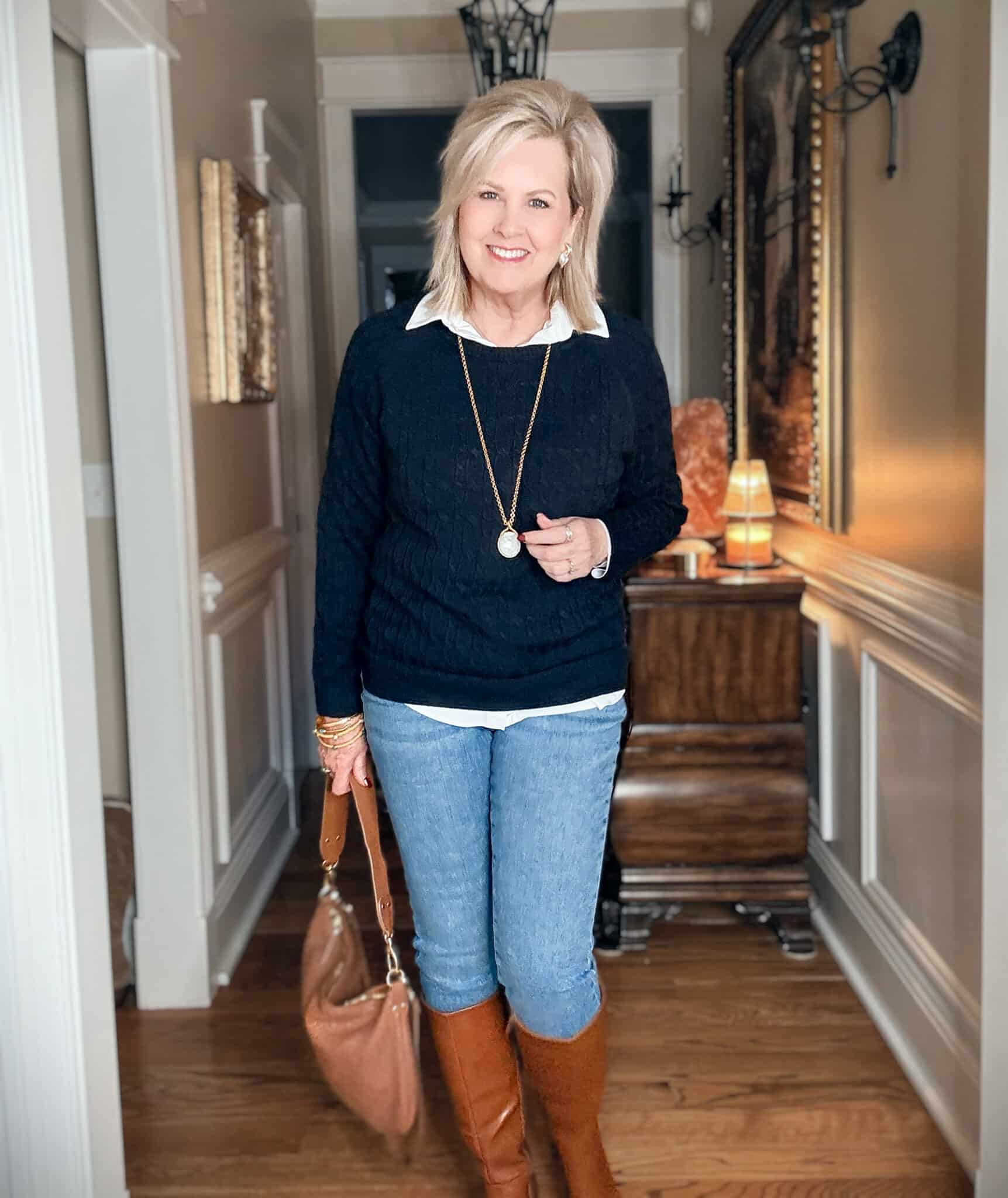 If you prefer a little more coverage up top, this cable knit crew neck is such a good option. The texture makes it feel classic and cozy, and the neckline sits comfortably without feeling tight. This is the kind of sweater that works beautifully with jeans, ankle boots, and a warm coat. It feels timeless, which is always a win. This is navy, but it’s available in a bunch of other colors.
