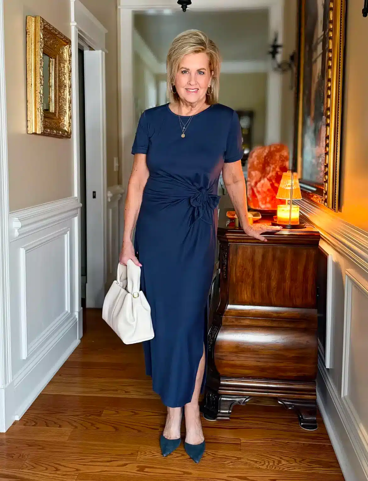 This navy dress is such a classy and understated option. The side knot detail cinches in at the waist just right, giving you shape without feeling too tight, and the slit on the side adds a touch of sass while still keeping things elegant. I loved this dress so much that I also bought it in black. Wouldn’t it be so pretty for a fall wedding or date night?!