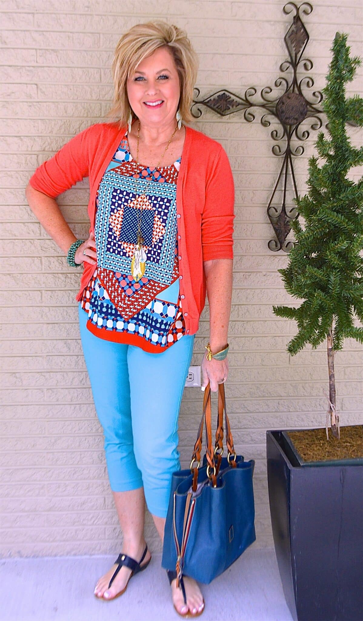 How about these cute crop pants? I love this bright turquoise color. These are a staple in the summer, you can wear them with a lot of colors. How about white, yellow, orange, navy, lime, or peach? Would you wear any of those colors with turquoise? I have a couple pants in different shades of turquoise so I held up the shirt and compared the pants until I found the one that matched the best. That is how I scientifically pick out my outfits in the mornings. Lol!