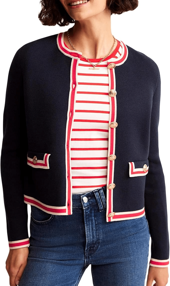 Boden is known for fun, polished layers, and this cardigan jacket fits right in. The color blocking and tweed-style knit make it feel elevated but still wearable. It’s great over dresses or with jeans.
