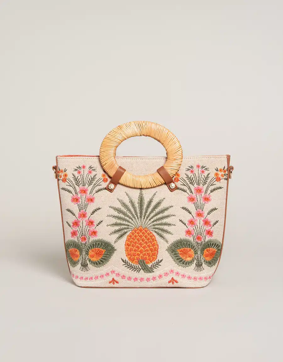 Gurls, how cute is this pineapple tote?! From the wicker handle to the beautiful embroidered details, I’m obsessed. It has a removable and adjustable leather strap so you can carry it as a shoulder bag or crossbody, or you can just use it as a top-handle handbag. This is a smaller, similar tote to the one I’m carrying above.