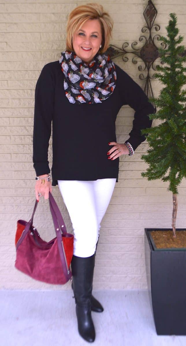 I put on these white jeans and Joe looked at me and said, “Are you supposed to wear white this late in the year?” Can you believe he questioned me? Lol! I told him we could wear white ANY time of the year. He simply shrugged his shoulders and said, “whatever.” I like the white with the black. I think this helped to dress the outfit up. It would have been fine with regular jeans, but the white made it look dressier. What do you think?