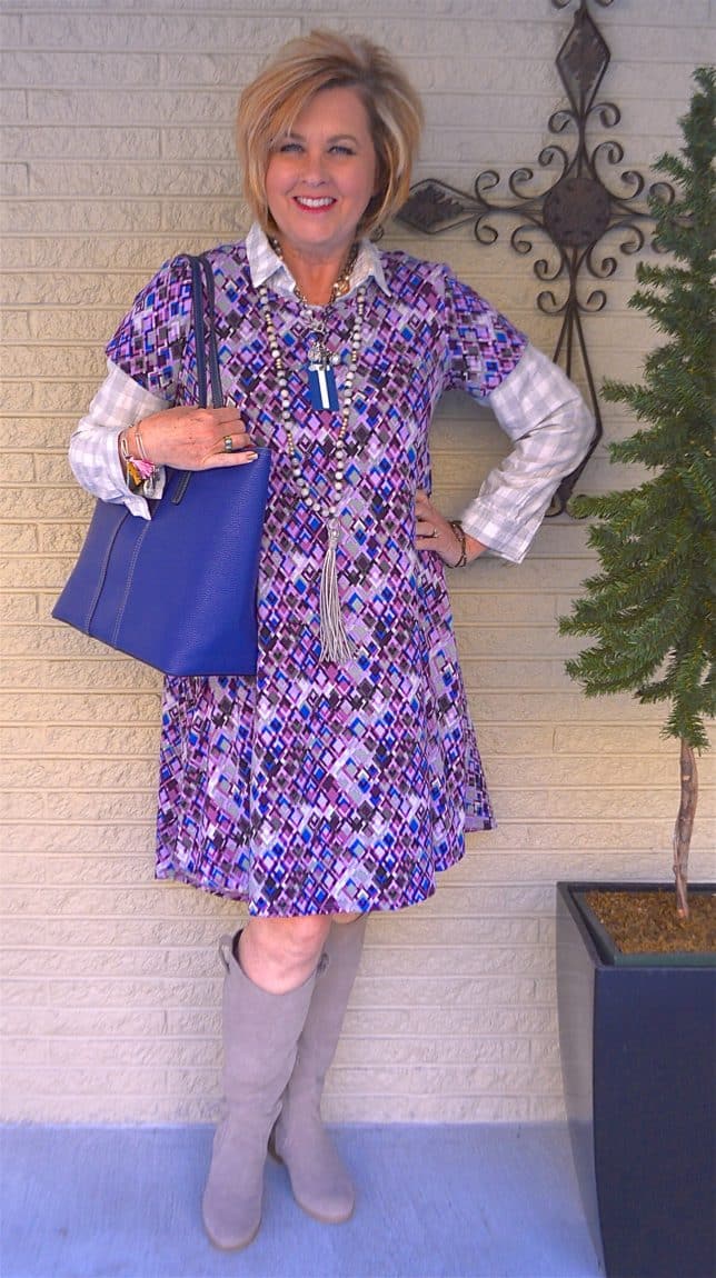 Now for this super cute swing dress. It is a LuLaRoe dress and I think this one is the Carly. I love, love, love the print and the colors in this dress. I wanted to wear the bright color to brighten my mood but it was short sleeve. Instead of wearing a long sleeve white button down or a turtleneck, I thought I would do some pattern mixing. I confess that pattern mixing is not really my cup of tea, but what the heck. Right? The gray in the shirt, plus the check pattern of the shirt, go with the colors and pattern in the dress. I ended up liking the final result. I probably would have liked a white shirt better but every once in a while you need to shake things up just a bit. I do not sell LuLaRoe so feel free to comment your website if you do.