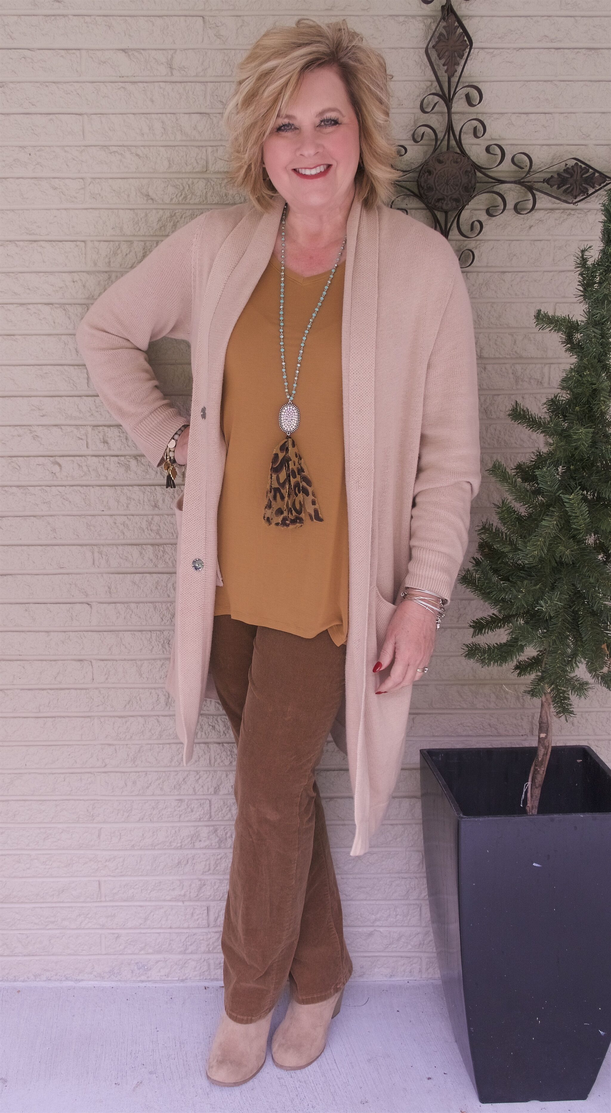 I am a fan of corduroy. I grew up wearing corduroy and it just feels comfortable to me. I am not sure that it is on the high end of fashion but, what the heck. I love the darker tan color, it is a richer version and I like that. This pair is by Ralph Lauren and I can’t remember where I got them. This is a bootcut version so I had no trouble pulling them over the top of my ankle boots from Old Navy, which are on sale right now.