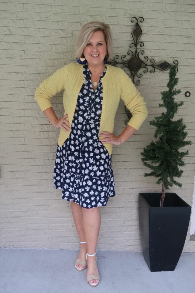 I took this picture before I left for Mexico (obviously) and the weather was chilly, so I added a yellow cardigan to match the yellow centers on the daisy print. My cardigan is very old, maybe ten years or more, and it is from Talbots. I normally keep a cardigan or light jacket in the car with me at this time of the year because it can be chilly in the mornings and afternoons. Plus, I am cold by nature, so I like having one when I go to a restaurant to eat.
