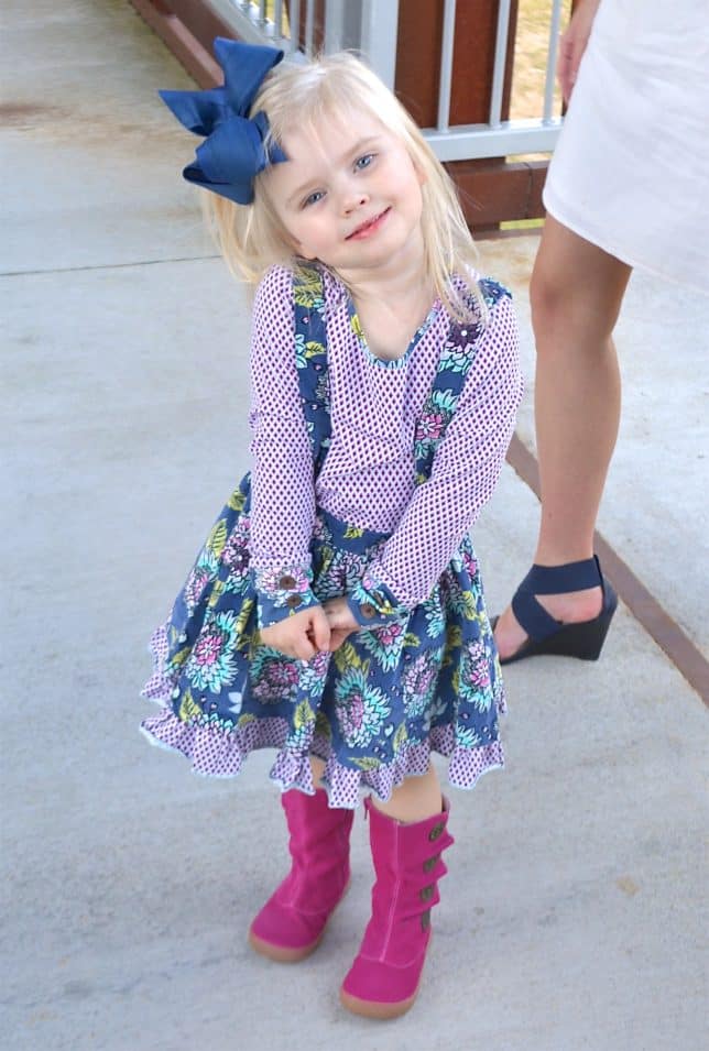 The cherry on top of the sundae is the Livie & Luca Boots. The bright fuchsia color pops with the outfit. Emersyn couldn’t help but strut in these boots – she loved them. The button accents, which look like clock faces, and the ruffled pleats, make these boots adorable.