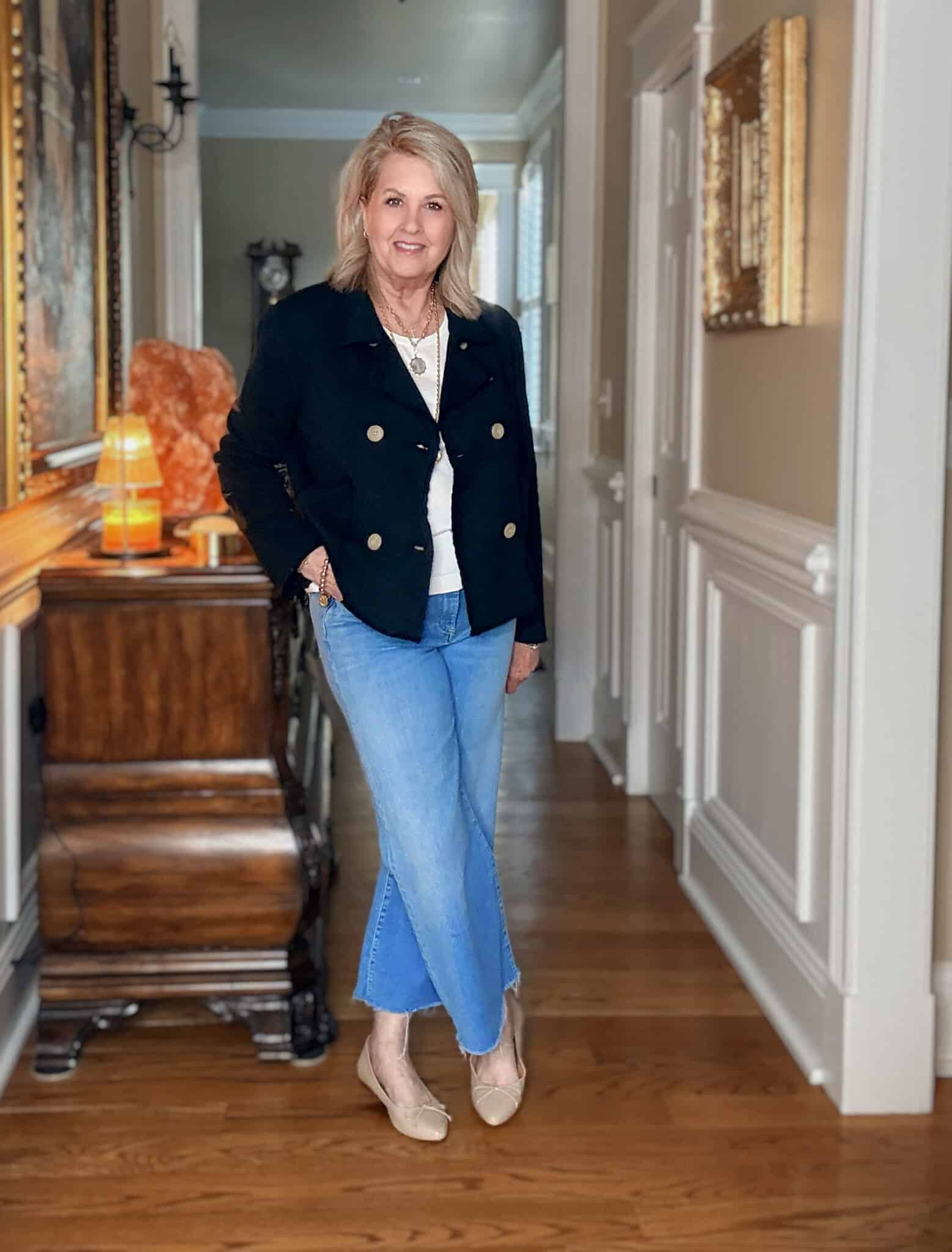 This is one of those outfits that looks simple at first glance. Navy jacket, white top, jeans, flats. Nothing dramatic. Nothing trendy.