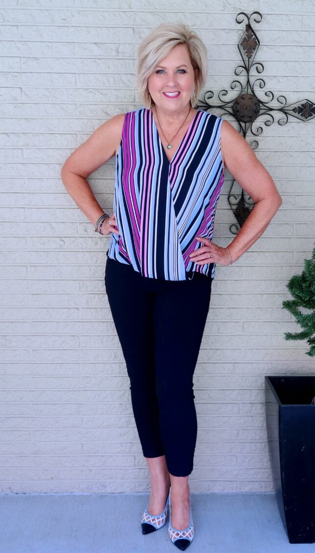 I bought this striped top by Vince Camuto right before we left to come on this trip. I like the blouson style and the faux-wrap top. Because I carry most of my weight in my mid-section, this soft billowy top in flattering to my body type. I also like the v-neck that the wrap creates; it helps to elongate my neck. It is recommended to size down for this top, and I am wearing a size medium, and it is perfect for me. I love these colors, especially this shade of purple. I think that I have bought several things lately that has the color of purple in it, and that is why I will be able to mix and match so many things in my wardrobe. Remember, buy what you like, and then you will find lots of items in your closet that will go with it. Here is the link to this top.