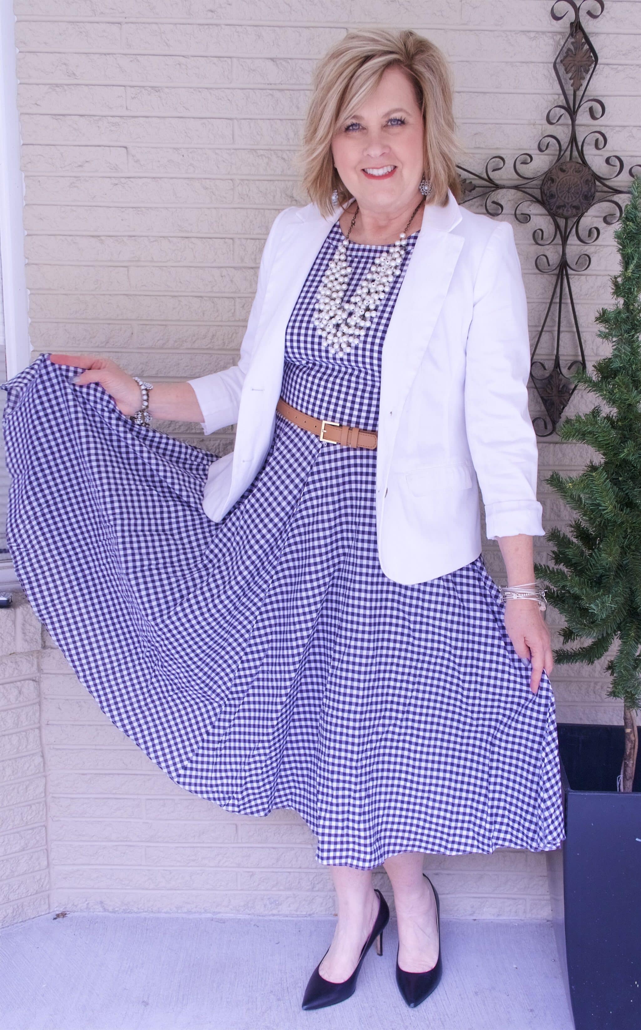 This is June Cleaver up dated to the 21st century or is it Dorothy in Oz? I mean that as a compliment and not as snark. The white jacket powers up your fit and flare gingham dress. The pearl necklace jazzes up the energy too. Feminine power.