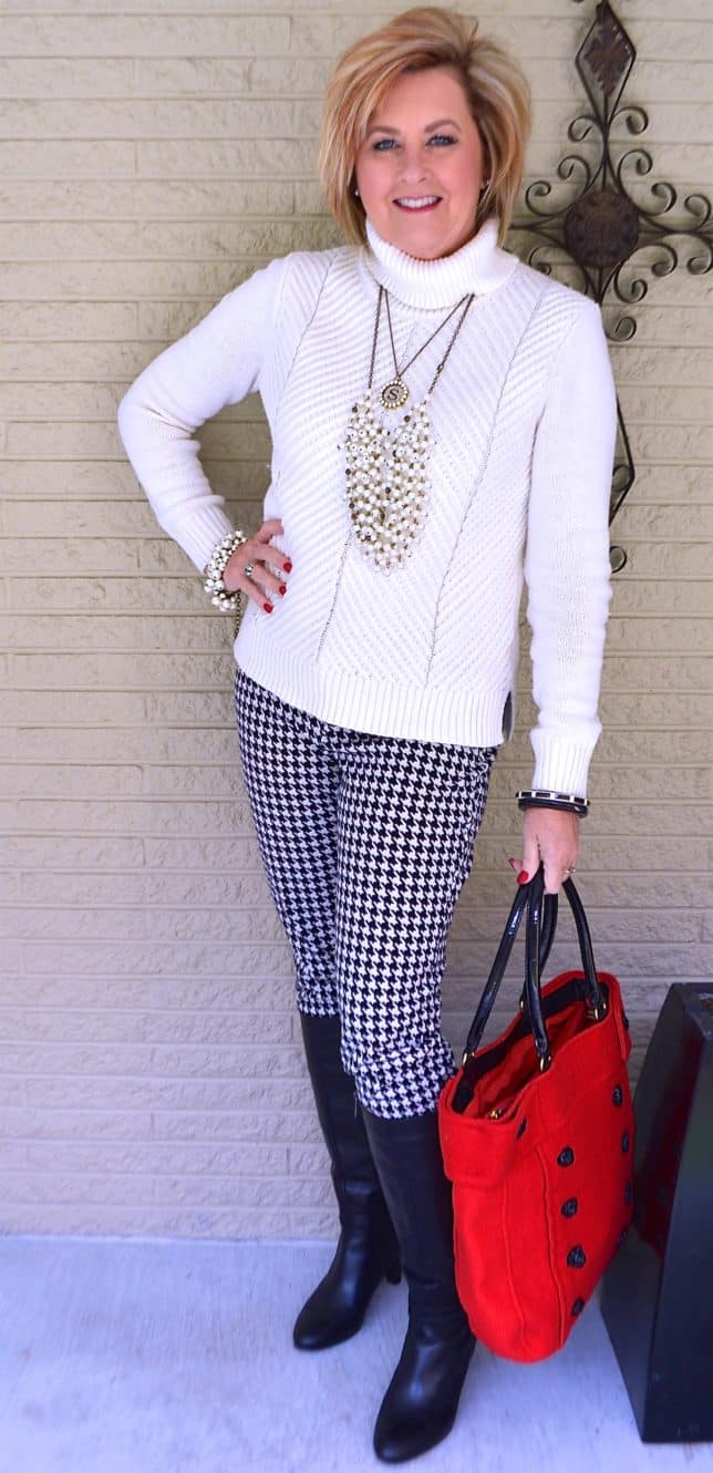 The pants are a pair of houndstooth pixie pants from Old Navy. I know, you are just shocked that I have on a pair of pixie pants. Lol! Seriously, you can find the pixie pant in a wide variety of solids and prints. Several of you have messaged me that you finally tired the pixie pants and are now hooked. Listen to me from now on. Hahaha