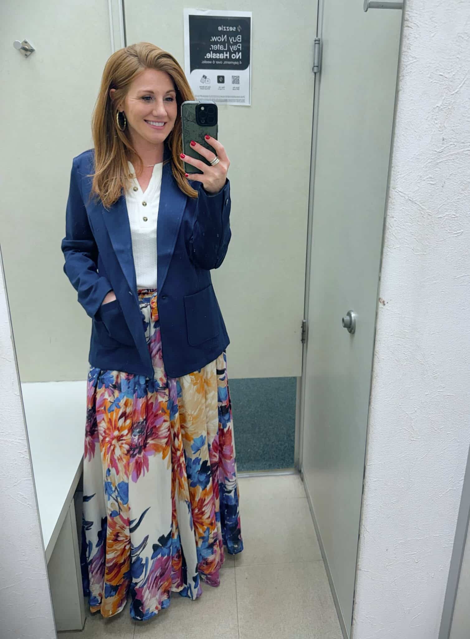 Stephanie paired the Tie Waist Multicolor Floral Maxi Skirt with the Solid Pointelle Henley and layered the Classic Ponte Blazer over the top. The skirt brings movement and color, while the blazer adds structure and sharpens the whole look. The henley keeps it soft and approachable underneath. She finished it with simple neutral loafers so the focus stayed on the silhouette rather than the shoes.