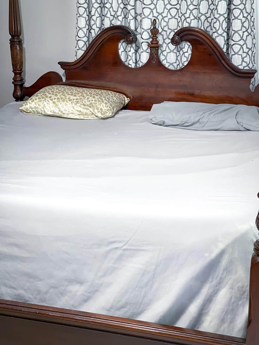 I’ve also updated the look of my bedroom in my older home. Joe is not a bedspread kind of guy, and he hates shams and pillows. Usually, our bed looks like this, just a blanket or a sheet.