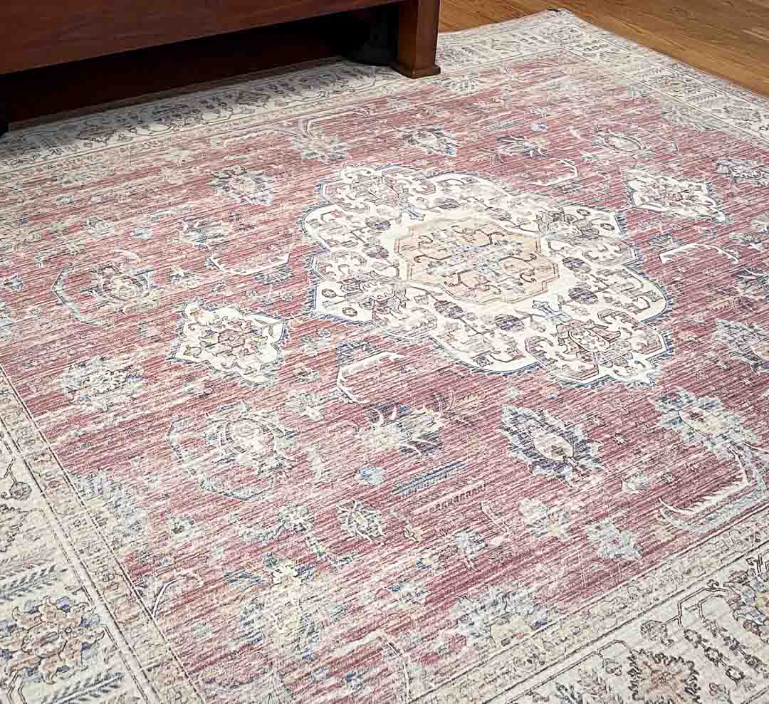 Here is a closer view of the rug and print. The rug is lightweight, and it laid down flat as soon as I opened it. This is a large rug, 7’6″ x 9’6″, so I probably won’t throw it in my washing machine even though it is washable. If the time ever comes that it needs washing, I’ll either take it outside to be lightly sprayed with the pressure washer or take it to a commercial laundry mat.