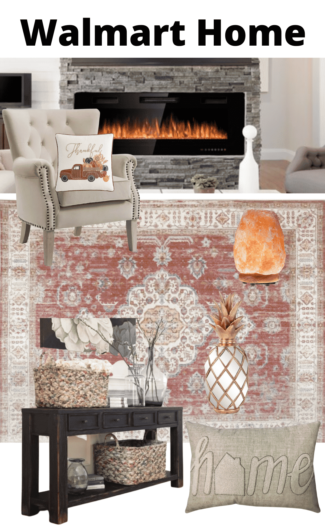 Fireplace (I want to put this in my basement office) // Washable Rug // Living Room Chair // Thankful Pillow // Salt Lamp // Sofa Table // Gold Pineapple // Home Pillow //