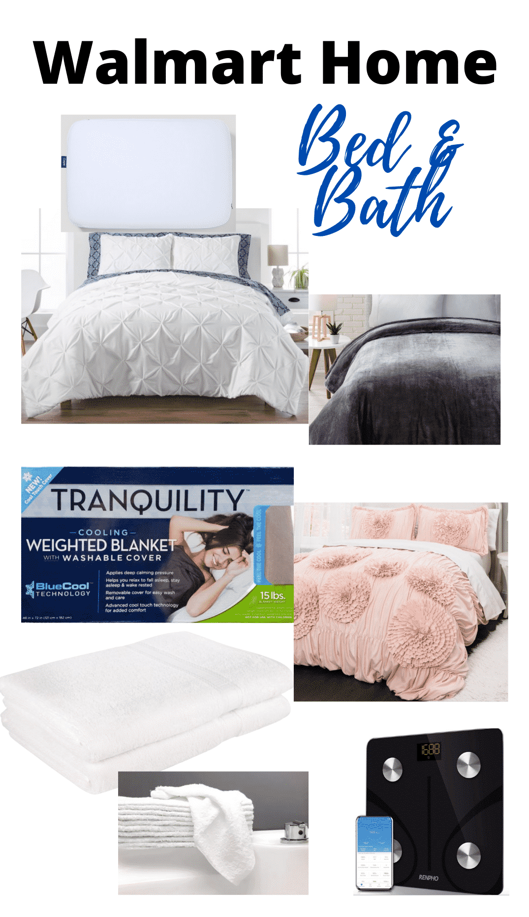 Casper Pillow // White Bedding Set // Gray Plush Blanket // Weighed Blanket (my parents love theirs) // Emersyn’s Bedding Set // White Towels and Washcloths // Bluetooth Scale //