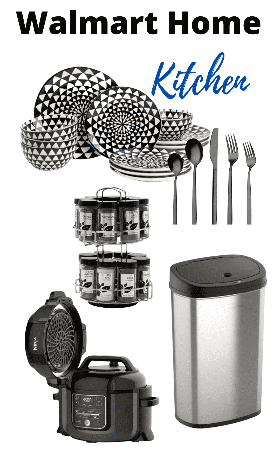 Dinnerware 12 pc Set // Black Silverware // Spice Rack w/spices // Ninja Foodie 8-n-1 (I have and love) // Motion Sensored Trash Can //