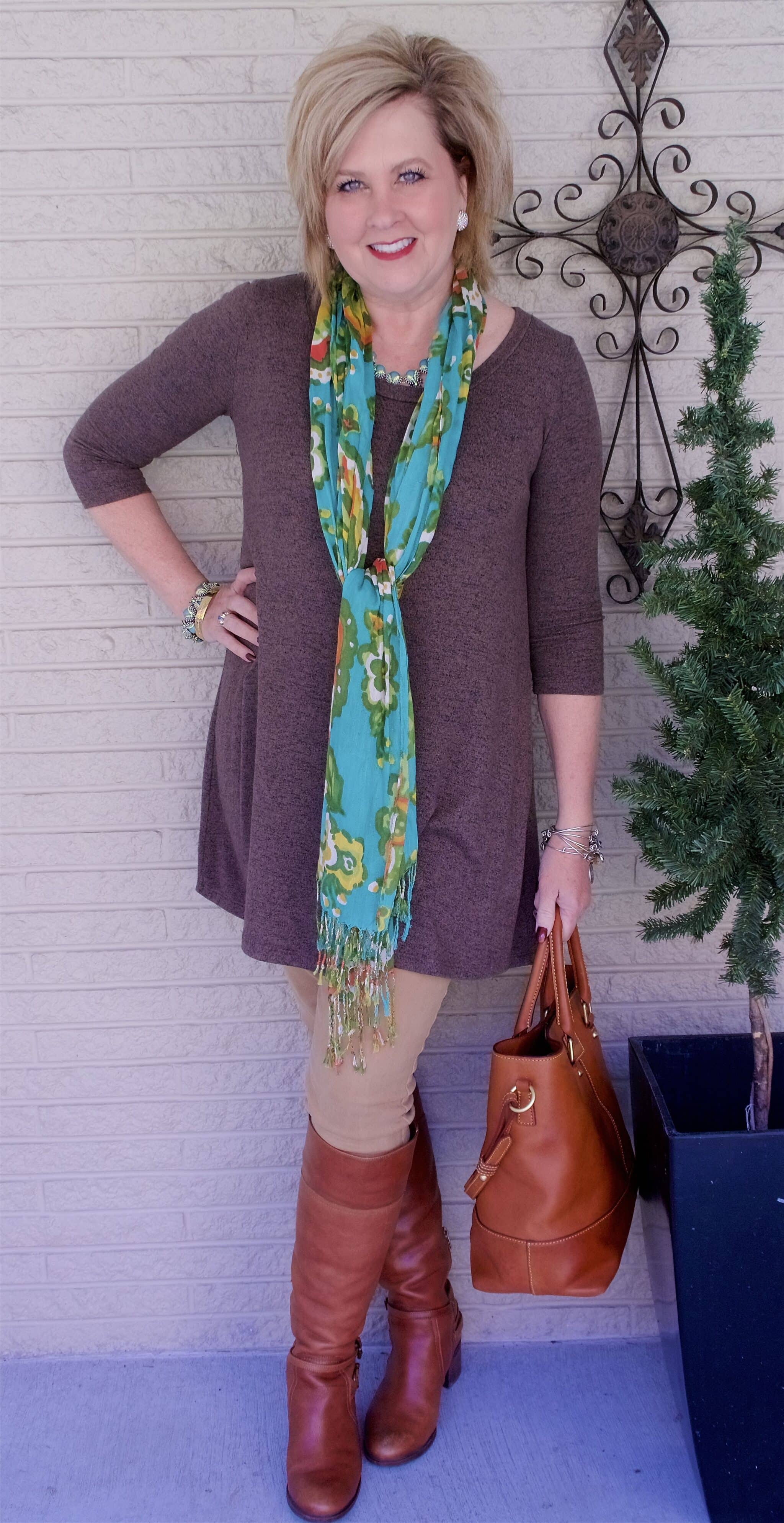 BTW, I wanted to remind you of the Best Senior Fashion Blog contest that is currently ongoing. It will be over on the 8th so I am asking you to please vote. I know that I may be ahead at this time but that could change quickly if the voting slows down. If you vote from your phone ( I don’t know how you can vote more on your cmputer) you can vote daily by hitting the refresh button. I was just told this, I thought it was a vote once option. Anyway, here is the link. I like this top because of the feel of the material. This top is several years old but I still pull it out every year because of how soft it is. I am like a small child when it comes to the material of my clothing. I want it to be soft and cozy and this top fits the bill. The problem is that it is not my favorite color. You can see how I remedied that problem and that would be by adding a brightly colored scarf to the outfit. I am always on the lookout for scarves when I go shopping. I buy colors and prints that I like without a specific top in mind to wear them with. Even though I don’t see any brown in this scarf, I still think it “goes” with the outfit. A scarf is a very affordable option to change the look of any outfit and I try to keep a huge supply on hand.