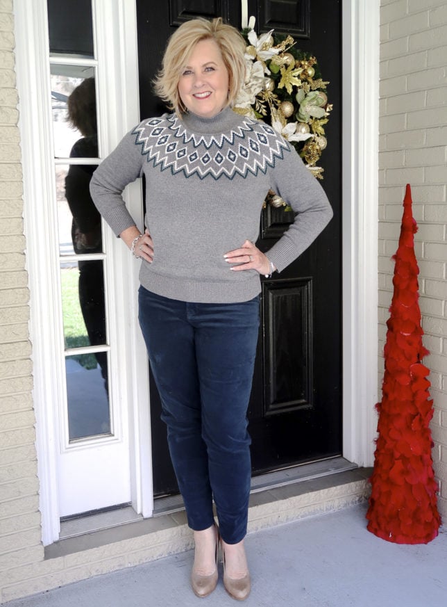 You might remember this deep teal corduroy pair of pants from this post back in early November. It is funny that I wore them with a Fairisle sweater back then also. I sent back the pair from the older post because they were too small, and I reordered them a size bigger. I have learned that when I purchase from the Time and Tru brand that I need to size up one size unless it is a stretchy pant. Here is the link to the pants.