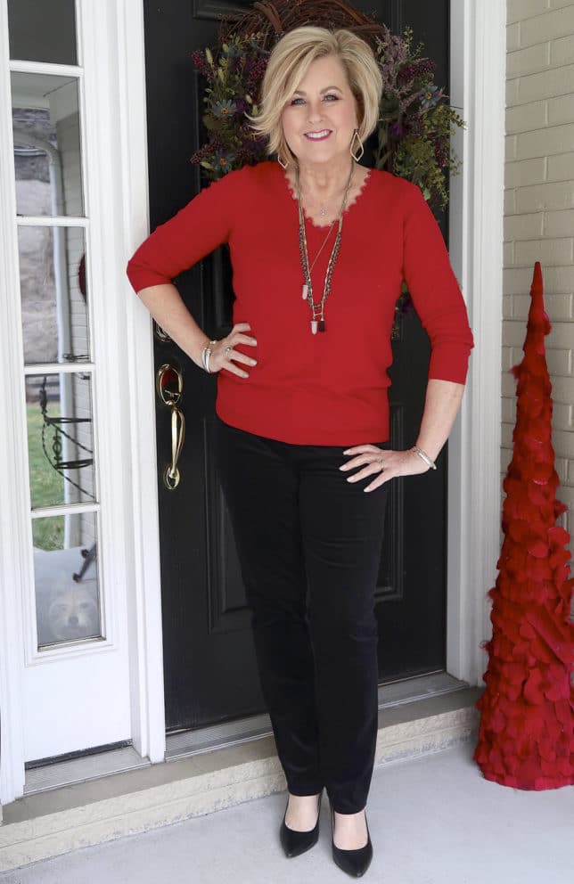 I bought these black velveteen straight-leg pants back when I went to North Myrtle Beach for a week. Joe played golf, and I spent my time shopping. I guess there are worse things that I could have done. Lol! I love how these pants fit and the straight leg is very flattering. Here is the link to the pants which are also on sale.