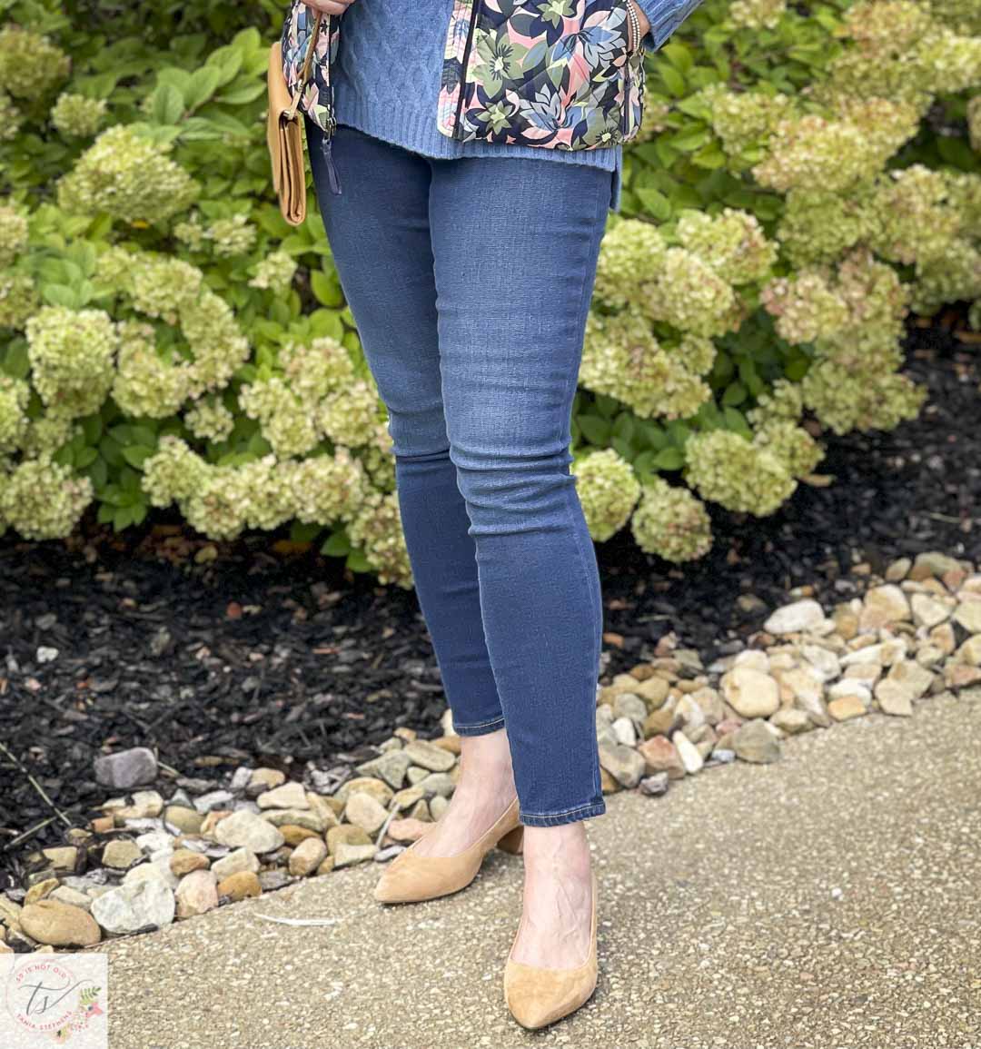 When I ordered these 9″ high-rise skinny jeans, I ordered two sizes. I loved the color and style of the jeans, but I wasn’t sure how they would fit. I usually wear a size 30, but the last two pairs of jeans that I had ordered in that size were too big. So, I ordered a size 30 and also a 29 just to cover my bases. These are the 29, and I like the way that these jeans feel and fit, so I’ll be sending back the other pair.
