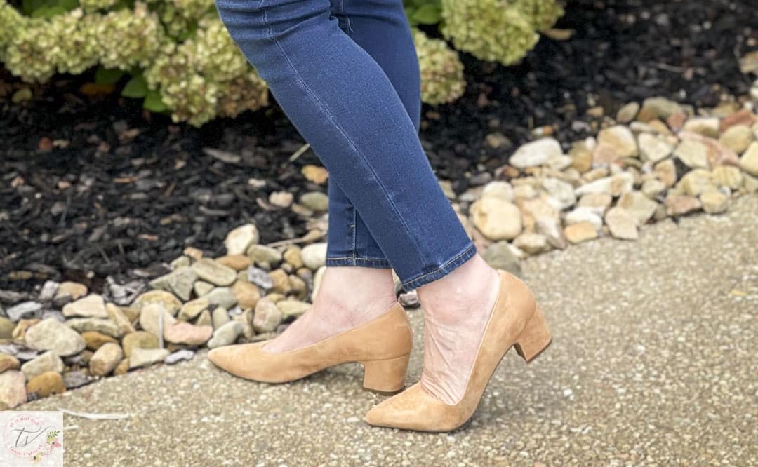 This suede chunky heel is a perfect neutral for this fall. The heel is not that high at 1 3/4″ so I think that most of you could manage this shoe. I love the pointy toe since it will elongate your legs, and make you look tall and lean. This shoe is on sale at 40% off, and there are several different colors and styles to choose from. I am wearing the cognac suede, even though it looks much darker on the website.