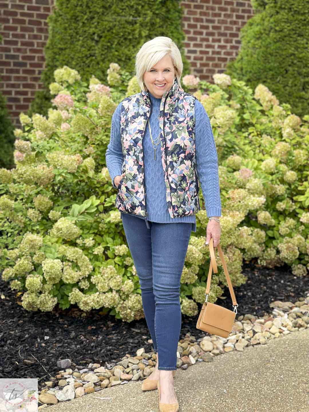 The cashmere sweater is warm enough to be worn by itself, but I found the prettiest puffer vest that I’ve ever seen, and I had to share it with all of you. I have a love/hate relationship with puffer vests. Most of them add so much unwanted bulk to my already chunky frame, that I steer clear of them. But, this one with the floral pattern and the gorgeous colors dared me to give it a try. I am so glad that I did, and I can see wearing this in the spring of the year also.
