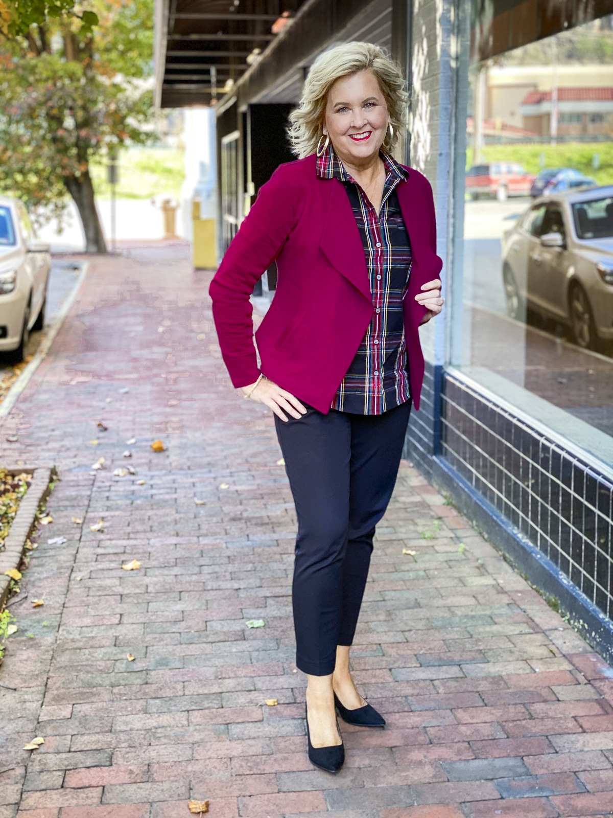 To give my look a more feminine vibe, I also chose to add my favorite blazer of the moment, this drape collar blazer in burgundy. This blazer is figure-flattering, and it helps to give me a waistline. Plus, the burgundy color of the blazer draws out the burgundy stripe in the plaid shirt. I am wearing a medium in this blazer, which fits me perfectly. I have linked to this blazer several times, and I noticed that the sizes are getting limited.