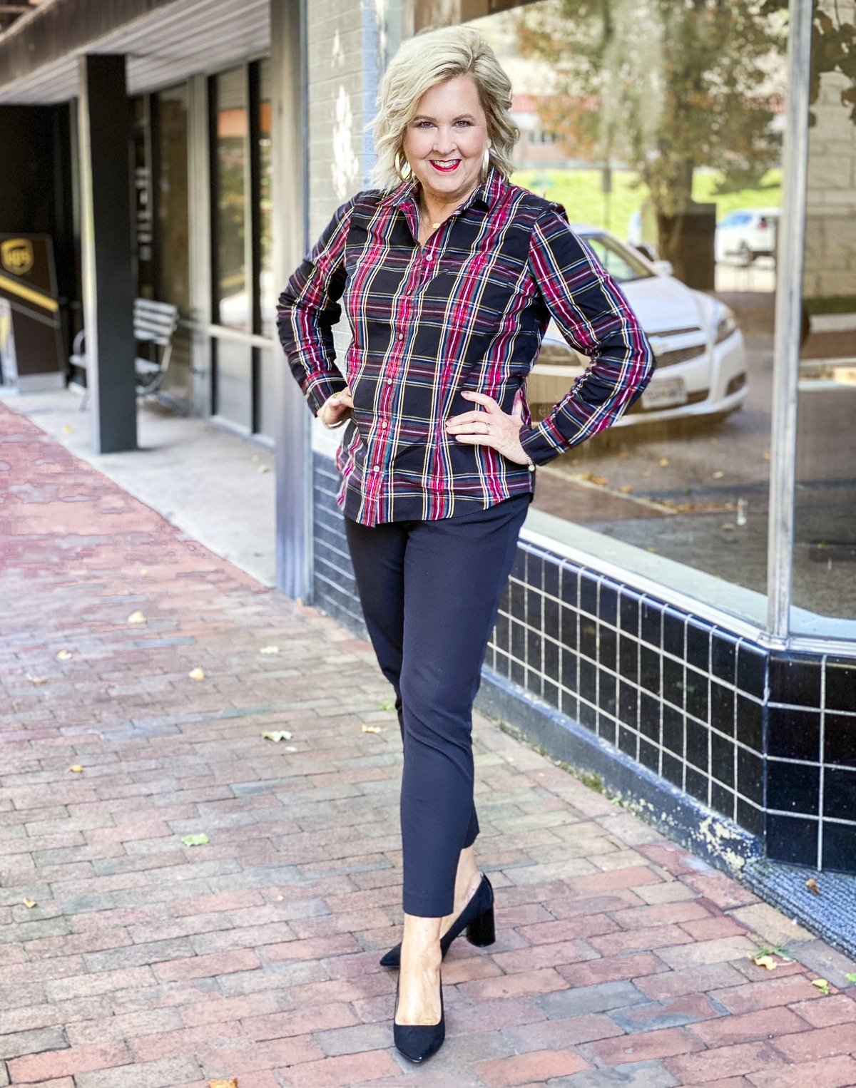 The first thing that I think of when I think of a plaid shirt is a lumberjack wearing a flannel shirt. Are any of you picturing the Brawny man on a roll of paper towels? Yeah, me too, and that is not the look that I am wanting. So, on today’s blog, I’ll show you a feminine take on a plaid button-up shirt without showing you my muscles.