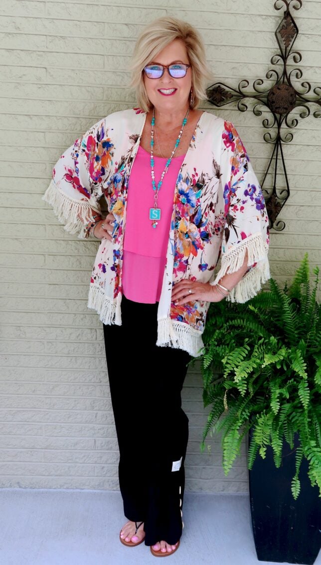 I wanted to bring out the turquoise in the kimono, so I added jewelry in that color. The necklace that I am wearing can be worn short or long. It does not come with the added pendant, so you can even use this as a lanyard. How cute would that be for your name badge? The necklace is the Marina, and when worn short, it is 17.5″ long. I added a two-sided pendant called the Brendalee. I can’t believe that I didn’t get a good photo of the pendant since it is so cute. It has my “S” initial in silver glitter on one side, and on the other side, it has a bright yellow background with a pretty butterfly. Here is the link to the pendant if you want a closer look.