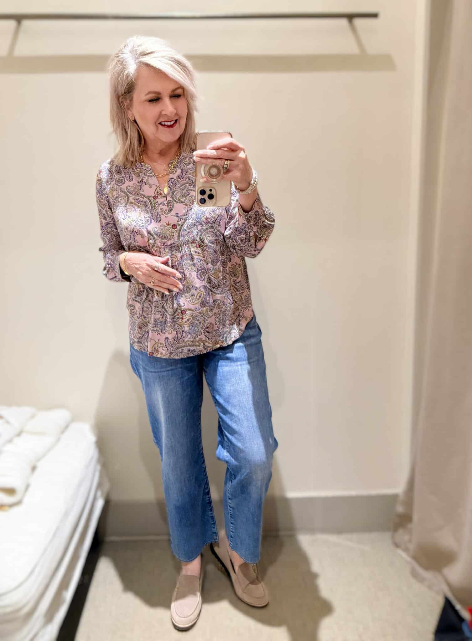 And I’ve also learned this. J.Jill runs generous. I’m usually between a medium and a large, but here I’m often between a small and a medium. So this try-on isn’t just about what’s new. It’s about what works, what doesn’t, and what I’d size differently after standing in the dressing room long enough to know better.