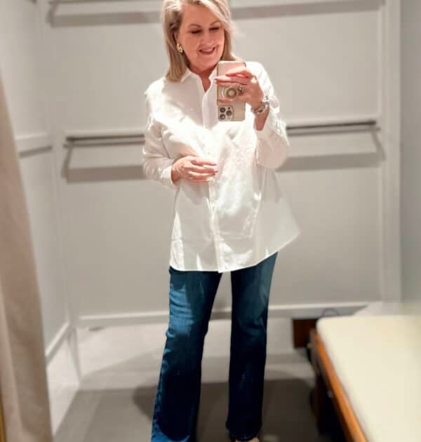 Here is a recent example of a simple layering technique. A button white shirt is a great base with a dark wash pair of Flare Jeans. Taking it up a notch is easy with this Textured Open-Front Cardigan.