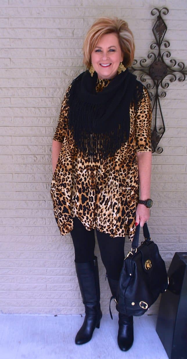 I wore black leggings under the tunic and I had a hard time deciding which shoe to wear. I’ll tell you which ones I wore and why at the end of the post. Here I had on my black boots ay Bandolino. I wore them the other day, (here) and you can see the links to them there.