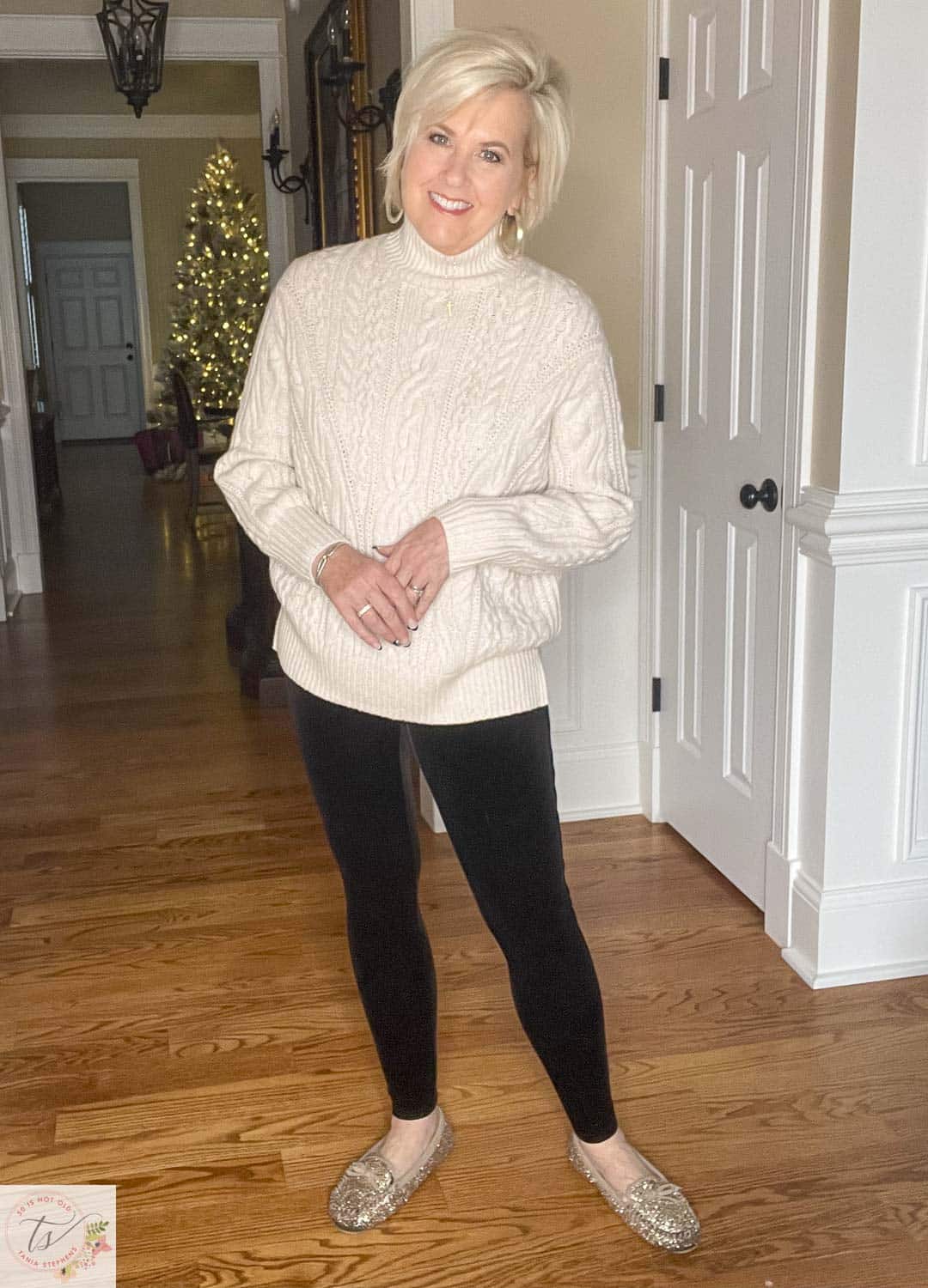 Here is the photo that shows you the length of the tunic sweater. You can see it’s plenty long and would work great with leggings. I did a French tuck on one side to create interest and elongate my legs. I’m wearing a size medium in this tunic sweater, and even though it’s oversized, I like the way it fits.