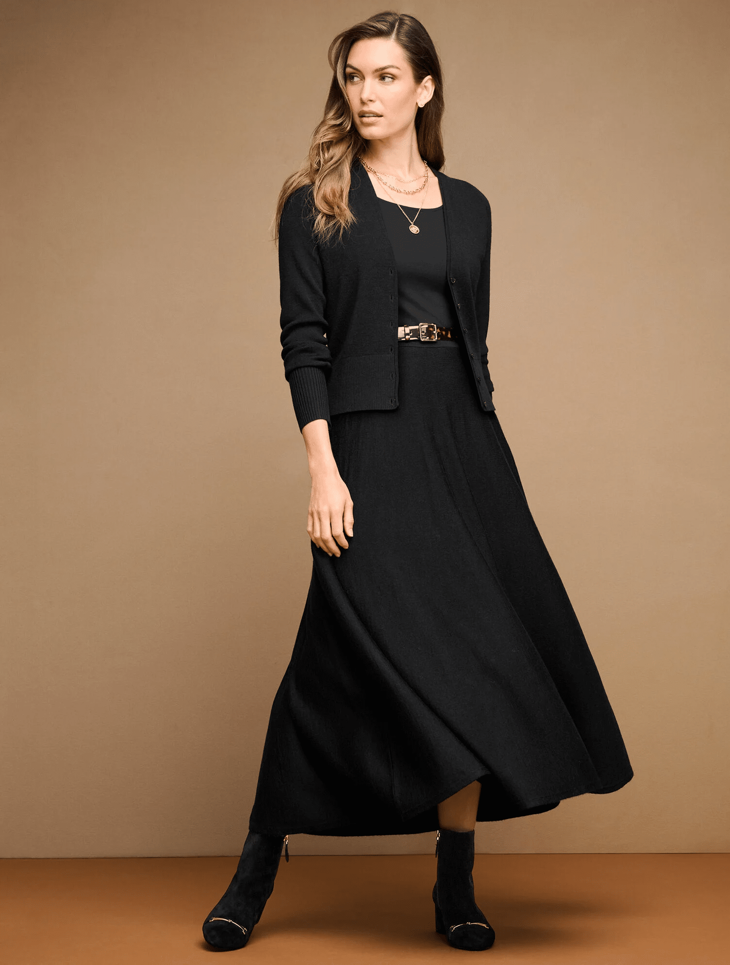 Denim A-Line Midi Skirt | Blondo® Sinner Booties (TTS) |  Open-Texture Cardi (Medium) | Black Perfect Shelf-Bra Tank (Large)