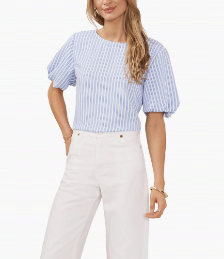 Here’s a great blouse from Vince Camuto to add to your line-up this season! You can never go wrong with a classic stripe. I think the top looks so classy styled with white bottoms, but you could easily switch them out for black, denim, khaki, etc.