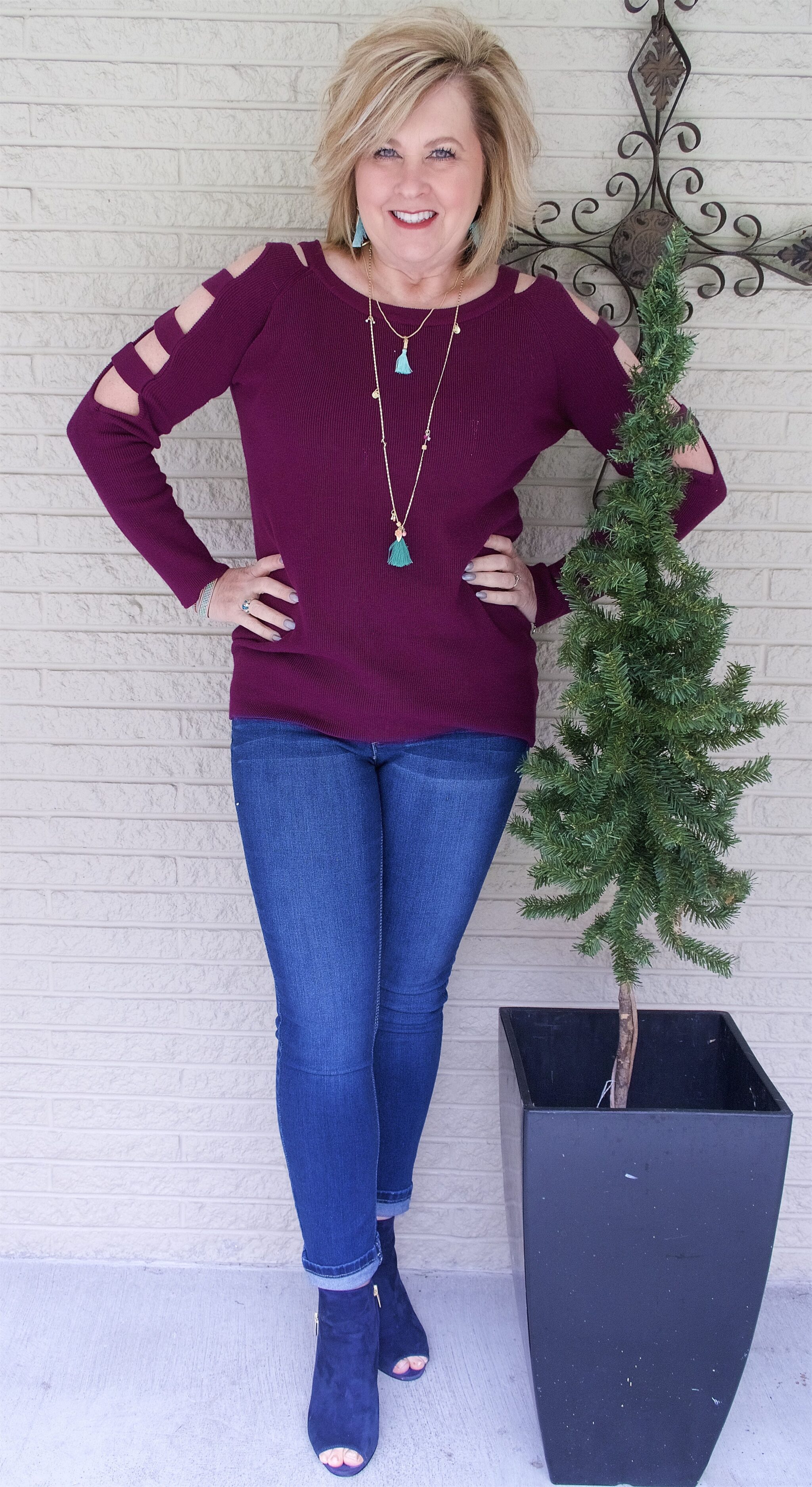 I bought this deep claret lattice sleeve sweater last fall at a local boutique in town. I like the uniqueness of the cold shoulder look, it is not so revealing and I feel a little more covered. I think it funny how I feel exposed when I am wearing a cold shoulder top but I don’t think twice about wearing a tank top in the summer. Lol! I guess it is because I feel like the rest of the sleeve is “supposed” to be there. Haha! This sweater is heavyweight and actually a little longer than I would like. Because of the weight, it tends to pull itself down and I feel like it stretches out of shape. I wore it in October with a much brighter color.