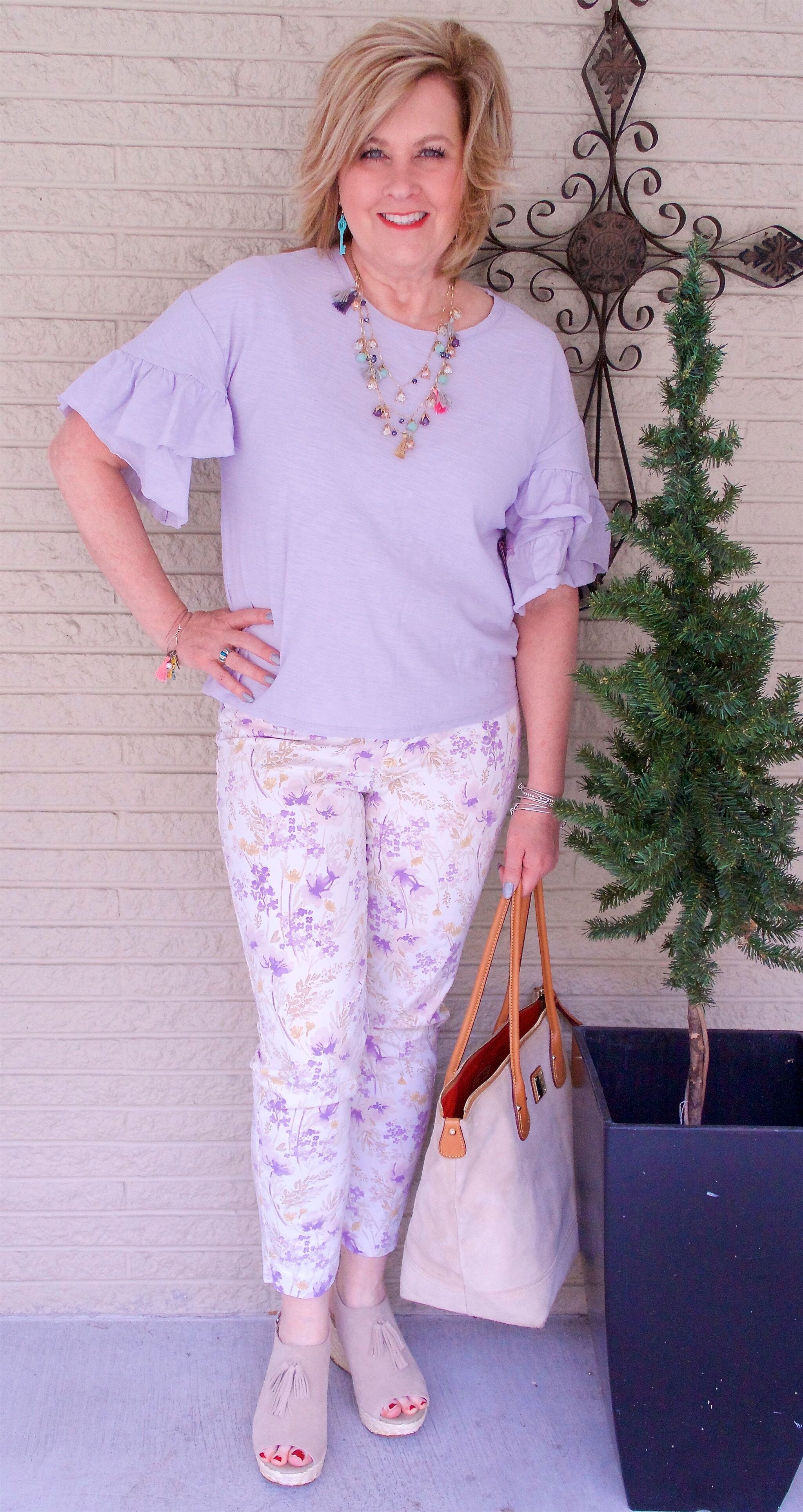 You look great. Love the lavender top..so flirty & feminine. Love the pants on you but probably not on me. Altho I wear printed capris! Go figure.