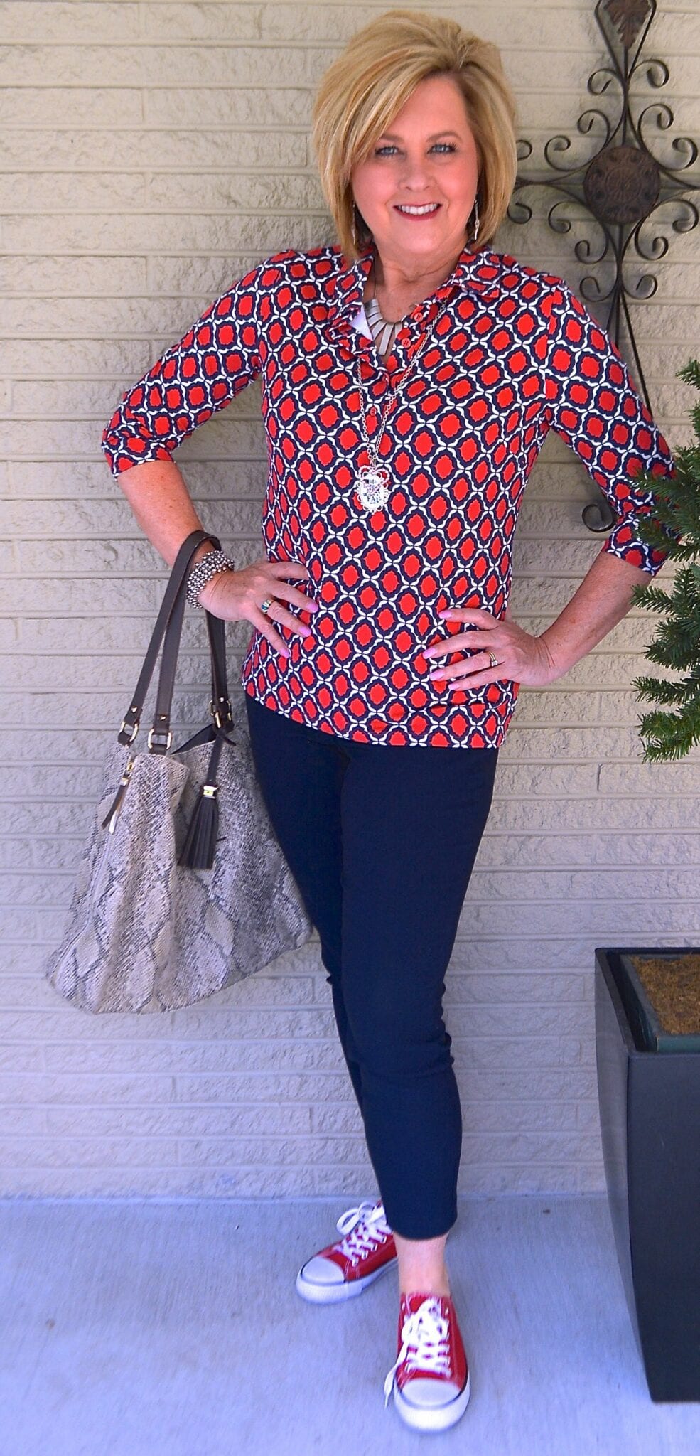 I have good news to report on my little pooch, Beckley. I took him back to the vet to be checked since he has been taking 2 shots a day for diabetes. They said his sugar levels were perfect and that he had gained back the 2 pounds he had lost. I am so relieved!!! I really hate having to give him the shots morning and night but he doesn’t seem to mind. I will call him and show him the shot. He walks over and bows his head for me to give him the shot. I always let him smell the shot to know what it is and he never even flinches. After his shot, he can’t wait for his treat. Lucy Lu gets a treat also but since she doesn’t have to take a shot, her treat is much smaller. Joe is so tender-hearted that he won’t even think about giving him the shot. He told me that he was petrified he was going to find him dead while I was gone. The vet’s office told me today that they weren’t sure he was going to make it either that day. Poor baby must have been in a horrible shape. He is all better now that his momma is back home. HahaToday marks the last of the casual looks I have been doing this week. It has been a laid-back, comfortable, casual, wearing flats kind of week. I might get used to this type of dressing. From all the comments you gurls left, I believe a lot of you must dress this way too. I bought this top at least a year ago at Talbots. I am a sucker for a red, white, and blue color palette. I am not a fan of the stars and stripes look, but I will wear the colors together often. I try to look for a top that has a pretty or unique pattern. This pattern reminds me of a block wall we had when I was growing up. You could see through the openings but it gave you some privacy also. Did any of you have those type walls? Ours was the outside wall of a carport.