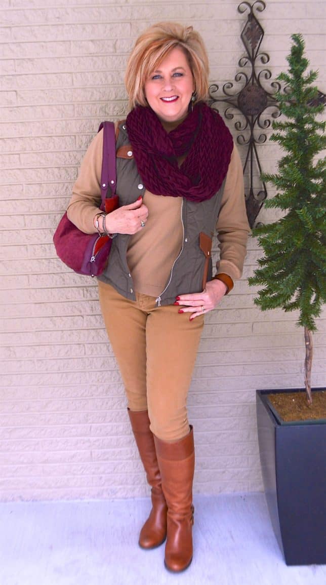 The camel colored pants are Old Navy Pixie pants. These are the longer length version but it wouldn’t matter since I paired them with my knee boots. I wear cropped pants and ankle pants with knee boots, that way I get more wear out of my purchases.
