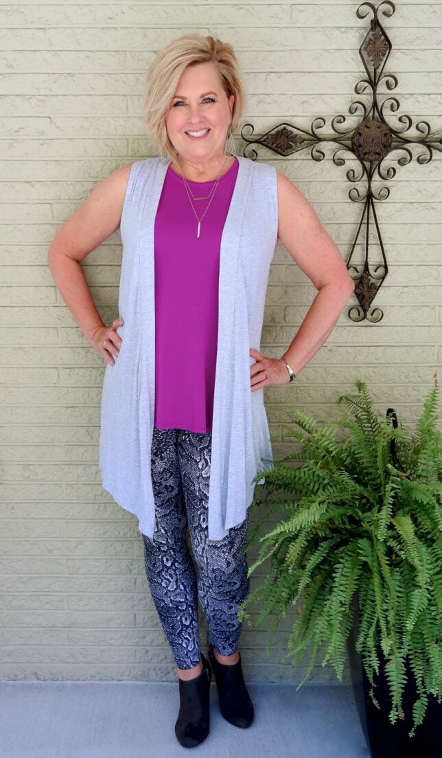I have had a few of you ask for a post with leggings. I haven’t been wearing leggings as much as before, and mostly only for lounging around the house. But, I decided to put on a pair with a print that will make some of your skin crawl. Snakeprint is all the rage this year, and I originally thought that I would wear these with some black boots later this fall. But, because I like versatility, I decided to see if I could come up with some outfit that would work for pre-fall. That time of the year before fall officially starts, but summer is coming to an end quickly. My leggings are a black, white, and shades of gray, so that makes adding almost any color to them easy. Those are all neutrals, so you can’t go wrong with anything that you pick to wear with them. I love adding a bright color with a neutral palette, but remember that you can add the color that suits you best. This is a tunic style tank top that I have had for a while. The color is a bright, vibrant fuschia/orchid. Adding the pop of color makes my face glow, and it feels more alive than a darker color. The tunic style top helps to hide tummy issues that seem to come along with aging. I was giving Joe the lecture on middle-age spread the other day, and telling him that it was a “real” thing.