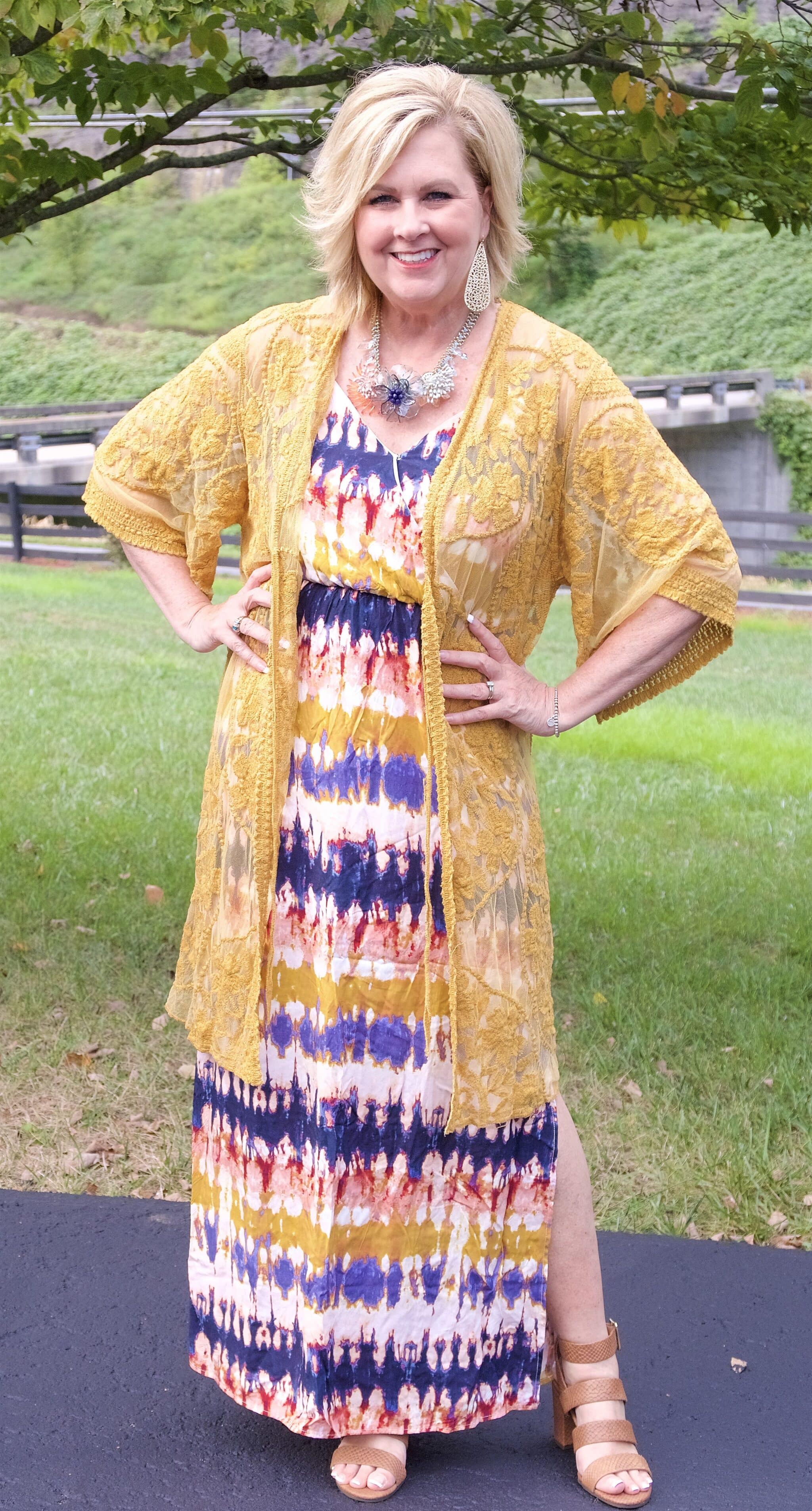 I just love the look of tie-dye. Maybe I am having flashbacks to my youth but there is something comforting to me about this pattern. How many of you have ever tried to do a tie-dyed shirt? Mine never turned out and all I would get was a muddy looking mess. Lol! However, my daughter and DIL are both very good at it. This dress is cute and very flattering on. It has the high empire waist, which is flattering to most people, and it also has the deep v-neckline and a wrap style. All of those features are flattering by themselves but this dress combines all of them. I am wearing a size large in this dress for a size reference. You will see later how the dress has a slit up one side so the dress is only lined down to that point. It is rayon so you can hand wash this and then lay flat to dry. I love the color combinations on this dress. The colors are bright enough to wear in the summer season but you can easily wear this in the fall as well by adding a cardigan or jacket. The dress is by One Clothing and you can find it by going here.