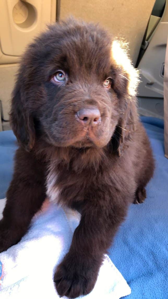 My son in Tennessee decided that for Christmas, as a family gift, they would get a Newfoundland puppy. The breeder where he purchased the dog was only forty miles away from my house. But, when you live in the mountains, you have to remember the roads are not straight. Instead, we hade to go over several mountains, ride beside the river and cross bridges, and encountered a slew of “kiss your butt” curves. If you are not familiar with that term, it means that by the time your car goes around the extremely steep curve you could stick your head out the window and kiss your butt. Lol! I think that you get the idea. Haha. We went prepared to have a car sick puppy on our way home. We took baby wipes, paper towels, and even a dog seat cover just in case he threw up. However, we were pleasantly surprised since he made it home just fine. I thought you might want to meet Koda (because he looks like a Kodiac bear) and some of his new family.