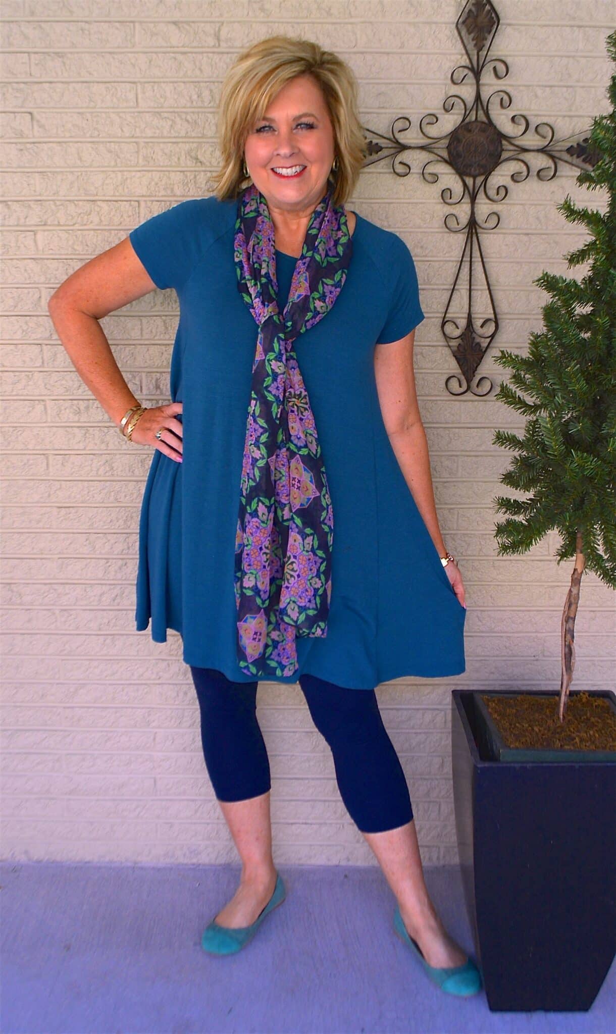 How easy was this? The swing dress has now taken on the look of a tunic because I added a pair of navy leggings. This pair of leggings are not really cropped leggings but I still wanted the look of crop leggings. I just scrunched them up until I go them to the length I wanted and the crinkles are hidden under the dress. This gives me two looks from the same pair of leggings. It is all about getting the most bang for your buck.