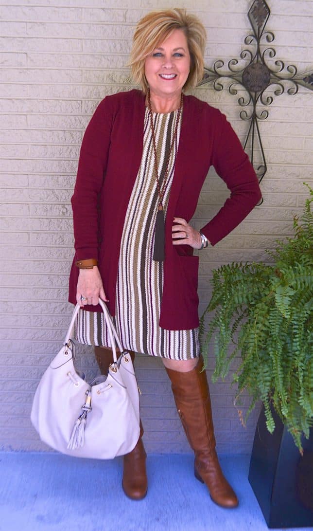 Sorry to hear that you’re feeling a bit blah. This outfit is lovely and I adore the colors. Cardi, dress and OTK boots make for a fabulous fashion formula.