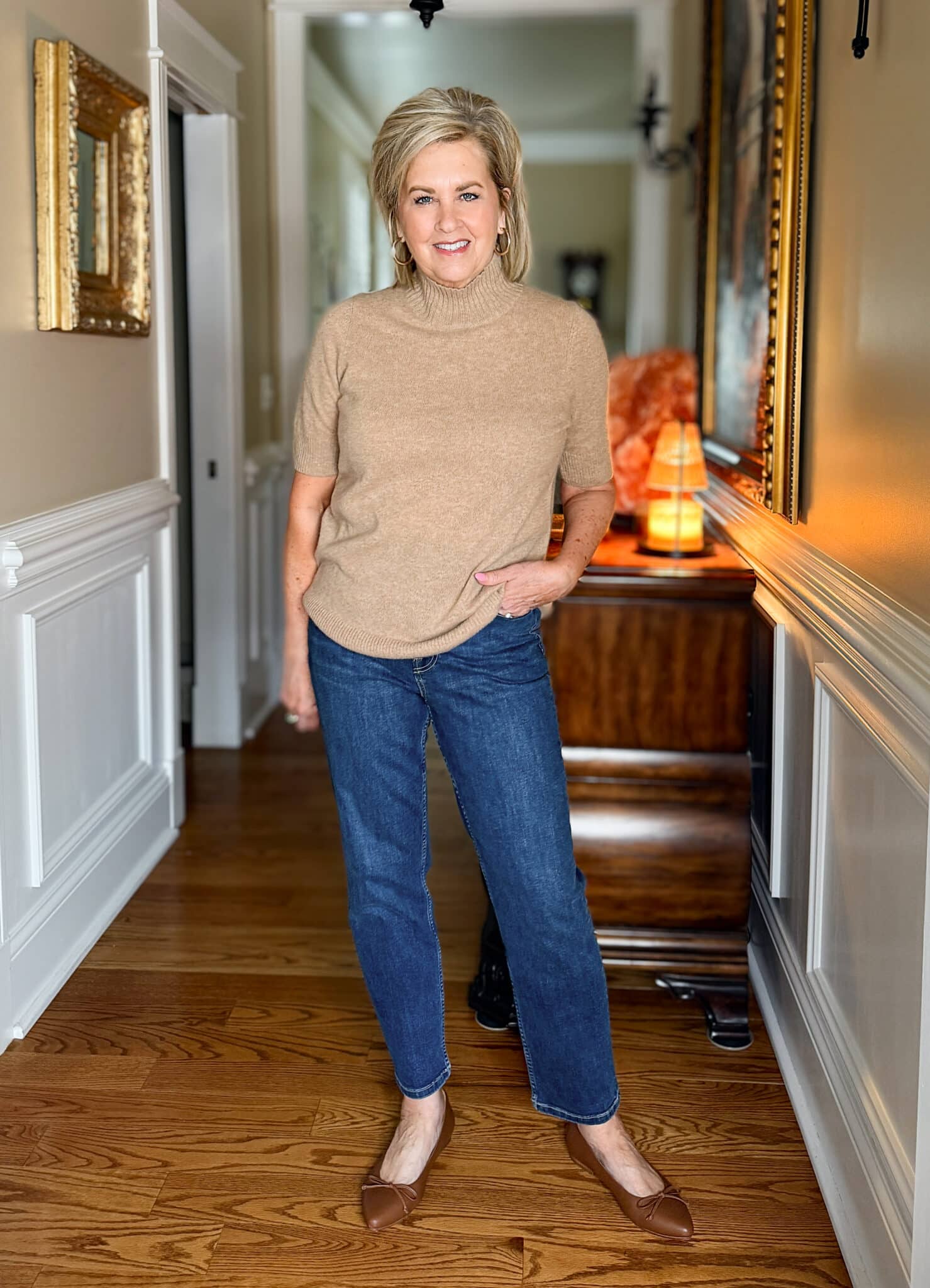 Let’s start with what I wore on one of those days where spring forgot to show up. This outfit is my answer to mornings that still have a bite in the air but don’t require full-blown winter gear. I started with this camel short-sleeve turtleneck sweater; it’s lightweight but still cozy, and perfect for layering. It is limited in size, so check out the Crewneck version, too.
