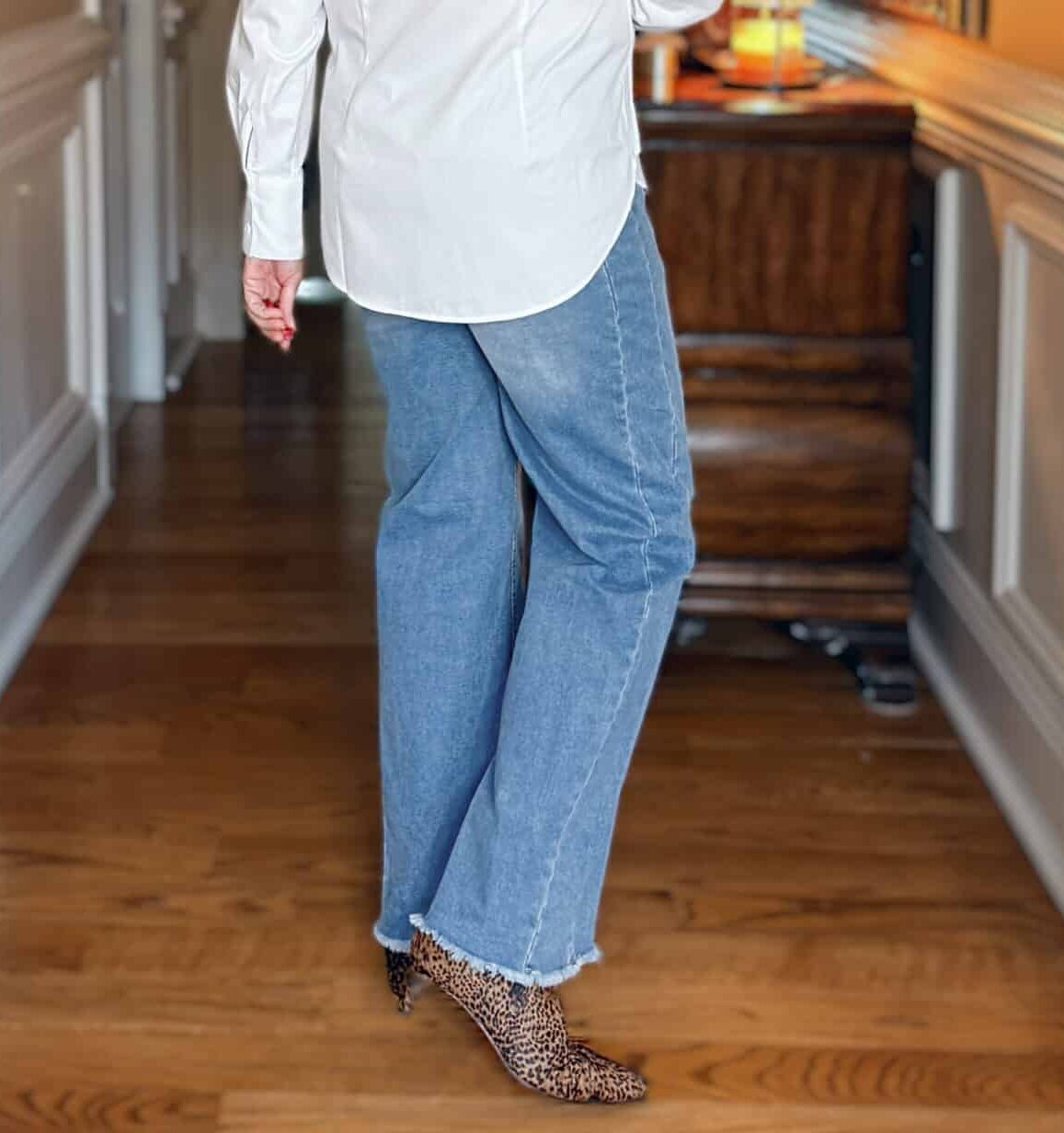 This look emphasizes the core value of the white button down shirt itself: a crisp, clean base that looks polished on its own, instantly ready for a casual yet sophisticated outing. The choice to leave the shirt untucked and paired with modern wide-leg jeans creates an effortless, relaxed silhouette, while animal-print booties add an unexpected pop of style.