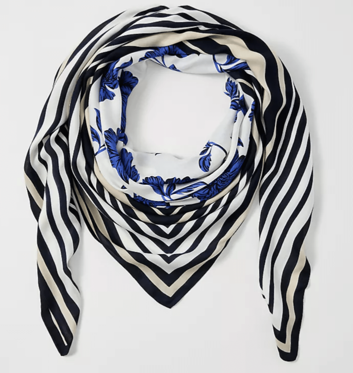 A floral square scarf is a spring staple for a reason. This one adds softness and femininity without overwhelming your outfit. It’s perfect for tying at the neck or slipping under a blazer collar. The stripes add some pizzazz!